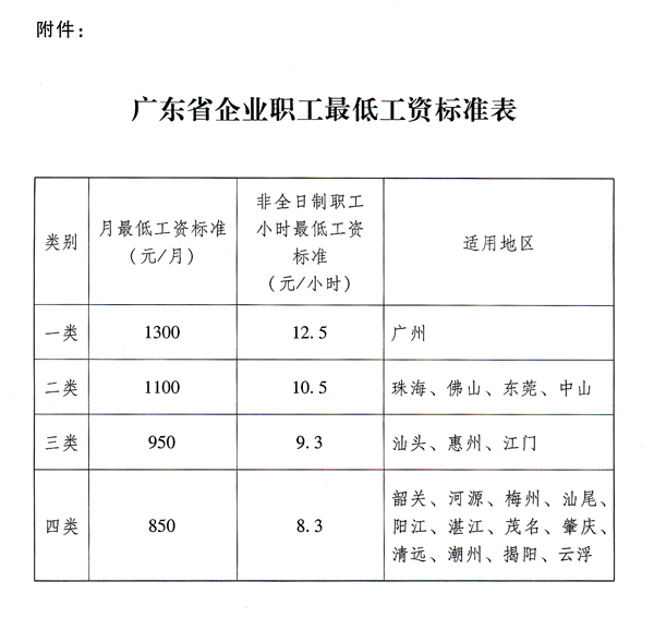 關(guān)于調(diào)整我省企業(yè)職工最低工資標(biāo)準(zhǔn)的通知 ? 各地級(jí)以上市人民政府,省政府各部門(mén)、各直屬機(jī)構(gòu): 根據(jù)《中華人民共和國(guó)勞動(dòng)法》、《最低工資規(guī)定》(原勞動(dòng)保障部令第21號(hào)),以及我省經(jīng)濟(jì)社會(huì)發(fā)展?fàn)顩r,為充分發(fā)揮最低工資標(biāo)準(zhǔn)的保障作用,提高低收入職工的收入水平,促進(jìn)社會(huì)和諧發(fā)展和幸福廣東建設(shè),現(xiàn)決定對(duì)我省企業(yè)職工最低工資標(biāo)準(zhǔn)進(jìn)行調(diào)整。有關(guān)事項(xiàng)通知如下: 一、從2011年3月1日起,調(diào)整我省企業(yè)職工最低工資標(biāo)準(zhǔn)和非全日制職工小時(shí)最低工資標(biāo)準(zhǔn)(具體標(biāo)準(zhǔn)和適用地區(qū)見(jiàn)附件,深圳市按《深圳市員工工資支付條例》執(zhí)行)。 各地級(jí)以上市原則上應(yīng)統(tǒng)一執(zhí)行省確定的標(biāo)準(zhǔn),有條件的地區(qū)可在省確定的標(biāo)準(zhǔn)上適當(dāng)上調(diào),并報(bào)省人力資源和社會(huì)保障廳備案。 二、各地級(jí)以上市政府應(yīng)在本通知下發(fā)之日起15日內(nèi),向社會(huì)公布本地區(qū)的最低工資標(biāo)準(zhǔn)。 三、各地要嚴(yán)格執(zhí)行最低工資保障制度,加大對(duì)提高最低工資標(biāo)準(zhǔn)的宣傳,加強(qiáng)檢查監(jiān)督,切實(shí)保障廣大職工的合法權(quán)益。 ? 附件:廣東省企業(yè)職工最低工資標(biāo)準(zhǔn)表 ? ? ? 廣東省人民政府 二○一一年一月十八日 ? ? |