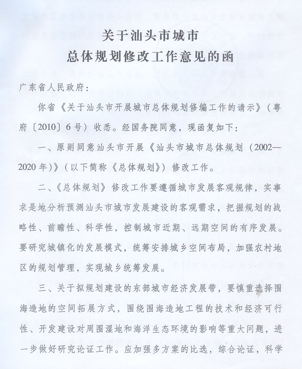 汕頭市人民政府,省住房城鄉(xiāng)建設(shè)廳: 現(xiàn)將住房和城鄉(xiāng)建設(shè)部《關(guān)于汕頭市城市總體規(guī)劃修改工作意見的函》(建規(guī)函〔2012〕42號)轉(zhuǎn)發(fā)給你們,請遵照實施。 ? 廣東省人民政府 二○一二年四月九日