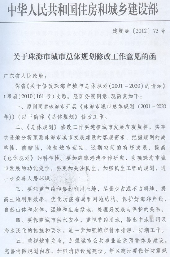 珠海市人民政府,省住房城鄉(xiāng)建設(shè)廳: 現(xiàn)將住房和城鄉(xiāng)建設(shè)部《關(guān)于珠海市城市總體規(guī)劃修改工作意見(jiàn)的函》(建規(guī)函〔2012〕73號(hào))轉(zhuǎn)發(fā)給你們,請(qǐng)遵照實(shí)施。