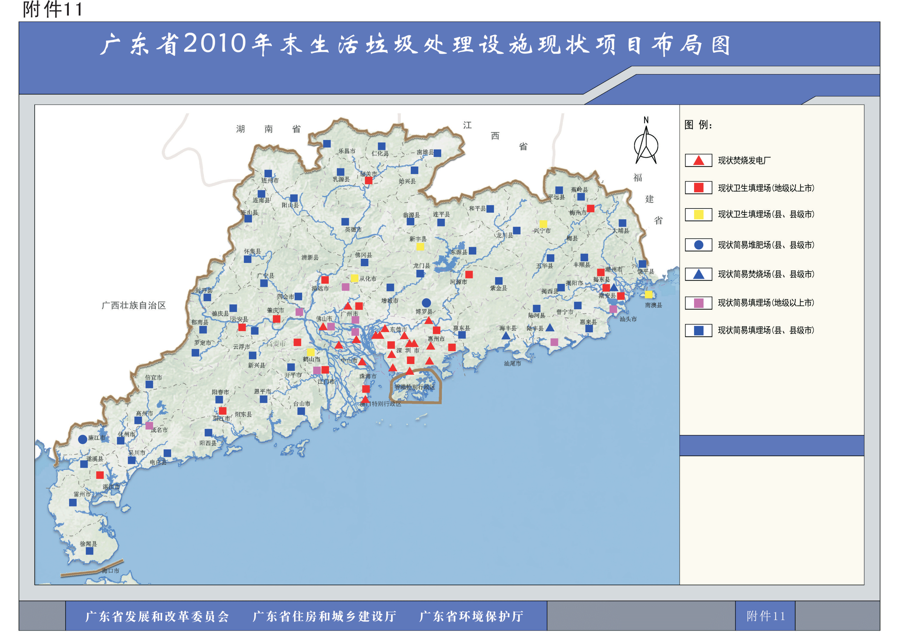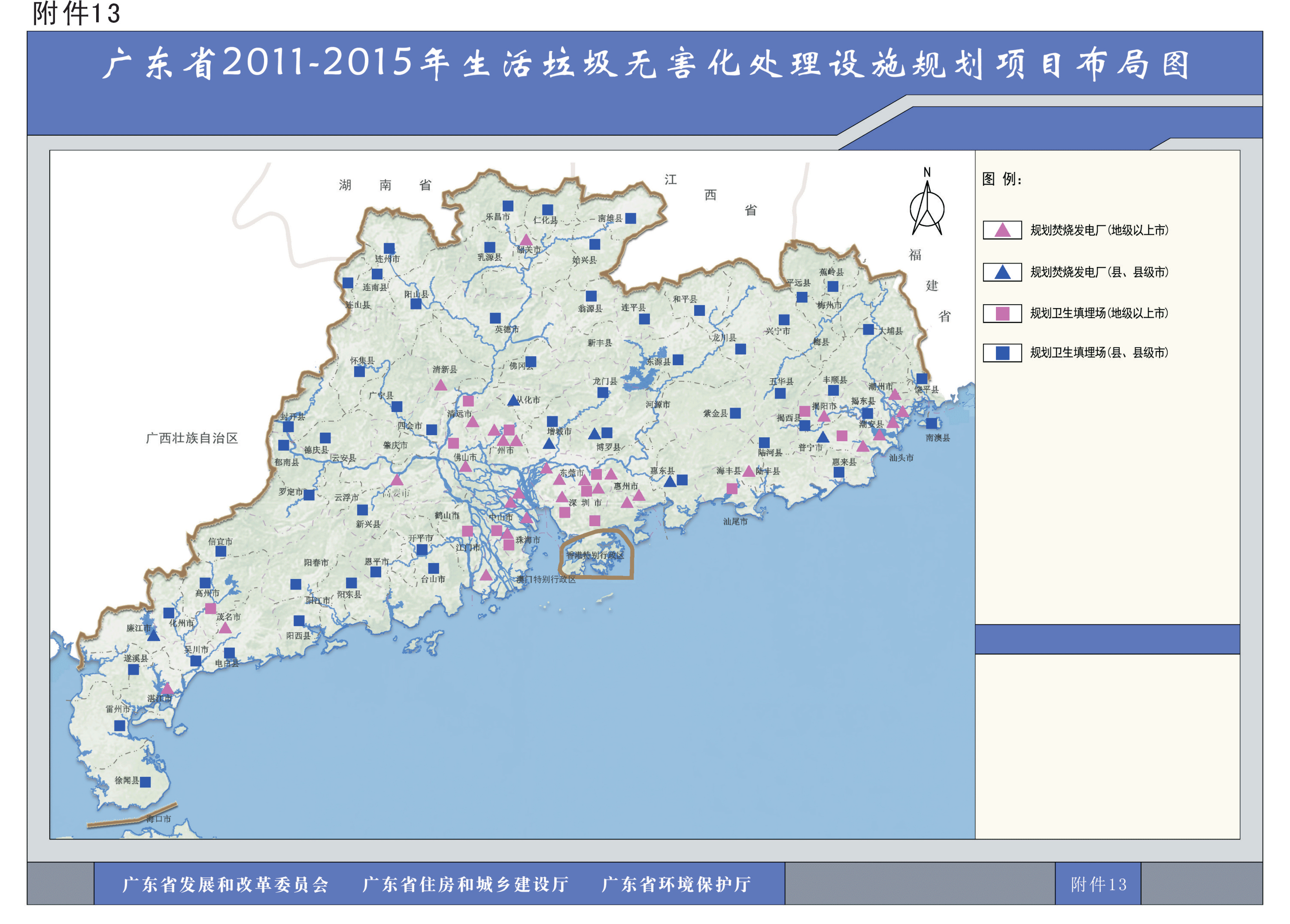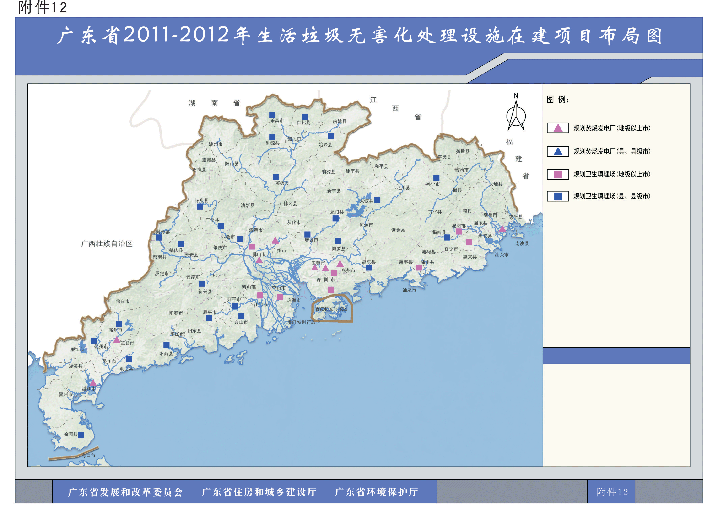 ? 廣東省人民政府辦公廳關(guān)于印發(fā)廣東省生活垃圾 無害化處理設(shè)施建設(shè)“十二五”規(guī)劃的通知 ? 各地級以上市人民政府,各縣(市、區(qū))人民政府,省政府各部門、各直屬機構(gòu): 《廣東省生活垃圾無害化處理設(shè)施建設(shè)“十二五”規(guī)劃》已經(jīng)省人民政府同意,現(xiàn)印發(fā)給你們,請認真組織實施。實施中遇到的問題,請徑向省發(fā)展改革委、住房城鄉(xiāng)建設(shè)廳、環(huán)境保護廳反映。 ? ? ? ? 廣東省人民政府辦公廳 2012年11月13日 ? ? ? ? ? 廣東省生活垃圾無害化處理設(shè)施建設(shè) “十二五”規(guī)劃 ? 目 錄 ? 一、現(xiàn)狀與問題……………………………………………………………………(1) ?。ㄒ唬┥罾幚憩F(xiàn)狀…………………………………………………………(1) (二)主要經(jīng)驗……………………………………………………………………(3) ?。ㄈ┐嬖趩栴}……………………………………………………………………(4) ?。ㄋ模┥罾a(chǎn)生量預(yù)測………………………………………………………(5) 二、指導(dǎo)思想、原則和目標………………………………………………………(6) (一)指導(dǎo)思想……………………………………………………………………(6) ?。ǘ┗驹瓌t……………………………………………………………………(6) ?。ㄈ┮?guī)劃目標……………………………………………………………………(7) 三、主要任務(wù)………………………………………………………………………(8) ?。ㄒ唬┻x擇生活垃圾無害化處理適用技術(shù)………………………………………(8) ?。ǘ┘涌焐罾鵁o害化處理設(shè)施建設(shè)………………………………………(9) ?。ㄈ┘哟蟠媪可罾幚韴觯◤S)治理力度………………………………(10) (四)完善收運轉(zhuǎn)運體系…………………………………………………………(10) ?。ㄎ澹┩菩猩罾鴾p量化、資源化和循環(huán)利用………………………………(11) 四、投資估算和資金籌措…………………………………………………………(13) ?。ㄒ唬┩顿Y估算……………………………………………………………………(13) ?。ǘ┵Y金籌措……………………………………………………………………(13) 五、保障措施………………………………………………………………………(14) ?。ㄒ唬娀M織保障………………………………………………………………(14) ?。ǘ┘訌婍椖拷ㄔO(shè)管理…………………………………………………………(17) ?。ㄈ娀弑U稀?9) 六、相關(guān)術(shù)語………………………………………………………………………(19) 附件1 廣東省2011-2012年生活垃圾無害化處理設(shè)施近期項目表……………(22) 附件2 廣東省2011-2015年生活垃圾無害化處理設(shè)施規(guī)劃項目表……………(25) 附件3 廣東省2011-2015年生活垃圾焚燒發(fā)電廠規(guī)劃項目表…………………(30) 附件4 廣東省2016-2020年生活垃圾焚燒發(fā)電廠儲備項目表…………………(33) 附件5 廣東省2011-2015年生活垃圾簡易處理場(廠)治理項目表…………(35) 附件6 廣東省2011-2015年生活垃圾無害化處理場(廠)封場項目表………(38) 附件7 廣東省2011-2015年生活垃圾轉(zhuǎn)運站及運輸車輛規(guī)劃表………………(41) 附件8 廣東省2011-2015年餐廚垃圾處理設(shè)施規(guī)劃項目表……………………(46) 附件9 廣東省2015年末生活垃圾無害化處理水平核算表……………………(48) 附件10 廣東省2011-2015年生活垃圾無害化處理設(shè)施規(guī)劃投資表 …………(52) 附件11 廣東省2010年末生活垃圾處理設(shè)施現(xiàn)狀項目布局圖…………………(53) 附件12 廣東省2011-2012年生活垃圾無害化處理設(shè)施在建項目布局圖 ……(54) 附件13 廣東省2011-2015年生活垃圾無害化處理設(shè)施規(guī)劃項目布局圖 ……(55) ? ? 為提高廣東省城鎮(zhèn)生活垃圾無害化處理水平,切實改善城鄉(xiāng)人居環(huán)境,根據(jù)《國務(wù)院辦公廳關(guān)于印發(fā)“十二五”全國城鎮(zhèn)生活垃圾無害化處理設(shè)施建設(shè)規(guī)劃的通知》(國辦發(fā)〔2012〕23號)的總體部署,編制本規(guī)劃。 本規(guī)劃范圍包括全省21個地級以上市的城區(qū)、23個縣級市的城區(qū)、44個縣城及生活垃圾處理設(shè)施服務(wù)輻射到的周邊鄉(xiāng)鎮(zhèn)(以上范圍在本規(guī)劃中統(tǒng)稱為城鎮(zhèn))。規(guī)劃基準年為2010年,規(guī)劃期為2011年至2015年,其中部分生活垃圾處理項目建設(shè)展望至2020年。 一、現(xiàn)狀與問題 生活垃圾處理是城鄉(xiāng)管理和環(huán)境保護的重要內(nèi)容,是政府履行公共服務(wù)職能的一項重要任務(wù),直接關(guān)系到人民群眾的切身利益。近年來,我省生活垃圾收運系統(tǒng)日趨完善,處理能力不斷提高,生活垃圾無害化處理水平總體上有了較大提升。 (一)生活垃圾處理現(xiàn)狀。 “十一五”期間全省除汕尾、茂名市外,其他19個地級以上市均建有一座以上生活垃圾無害化處理設(shè)施。南澳、從化、新豐、興寧、鶴山等5個縣(市)各建有一座生活垃圾無害化處理設(shè)施,揭東、高要、陽東、清新、云安、梅縣等6個縣(市)的生活垃圾運往所在地級市進行無害化處理,