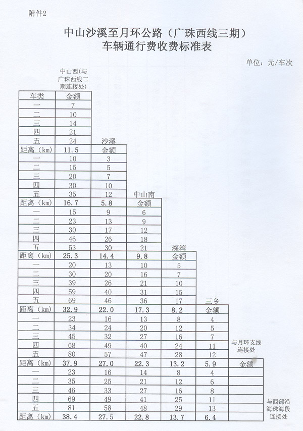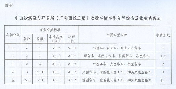 ? 廣東省人民政府辦公廳關于中山沙溪至月環(huán) 公路車輛通行費有關問題的復函 ? 省交通運輸廳、物價局: 粵交費〔2012〕1332號請示收悉。省人民政府同意中山沙溪至月環(huán)公路(廣珠西線三期)交工驗收通車和收費站收費設施經驗收符合省聯網收費技術要求后開始收費,收費車型按全省高速公路統一標準,即按車輛軸(輪)數及車頭高度等物理參數進行分類,一至五類車的收費系數分別為1、1.5、2、3、3.5;收費標準按雙向6 車道以上0.6元/標準車公里執(zhí)行。 ? ? 附件:1.中山沙溪至月環(huán)公路(廣珠西線三期)收費車輛車型分類標準及收費系數表 2.中山沙溪至月環(huán)公路(廣珠西線三期)車輛通行費收費標準表 ? ? ? 省府辦公廳 2012年12月20日 ? ? ? |