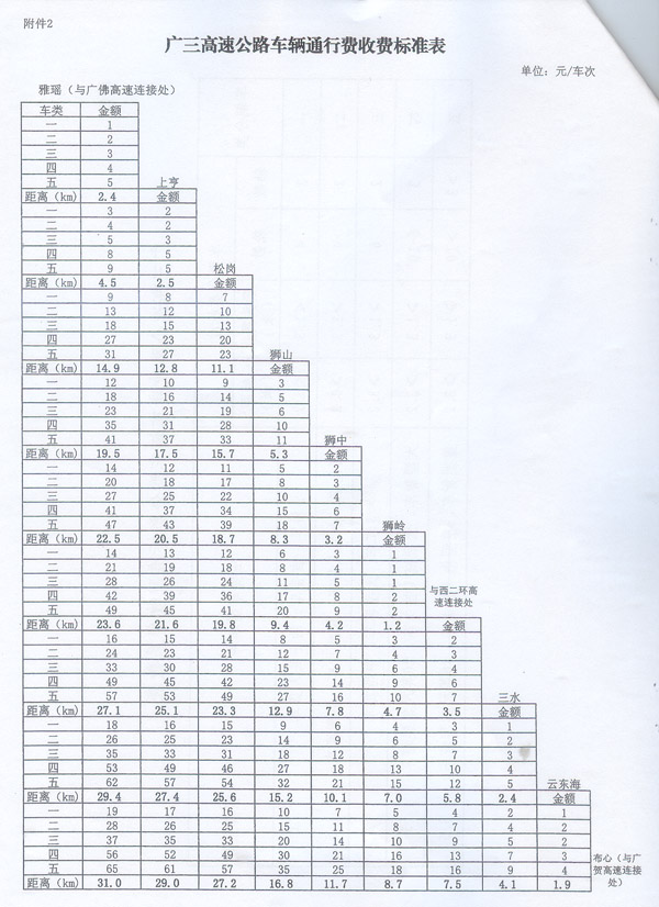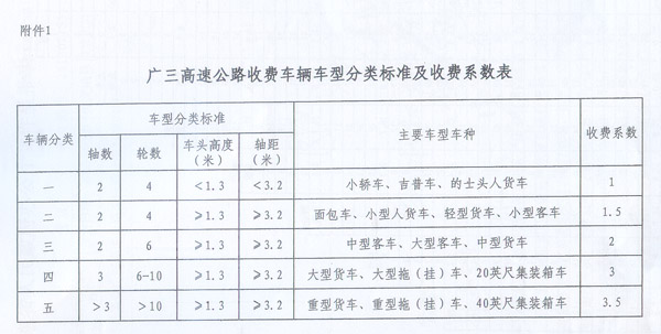 粵交費(fèi)〔2013〕155、224號(hào)請(qǐng)示收悉。省人民政府同意廣三高速公路改擴(kuò)建工程設(shè)立云東海匝道收費(fèi)站。該擴(kuò)建工程交工驗(yàn)收通車(chē)和收費(fèi)站收費(fèi)設(shè)施經(jīng)驗(yàn)收符合省聯(lián)網(wǎng)收費(fèi)技術(shù)要求后,廣三高速公路按全省高速公路統(tǒng)一標(biāo)準(zhǔn)進(jìn)行收費(fèi),即收費(fèi)車(chē)型按車(chē)輛軸(輪)數(shù)及車(chē)頭高度等物理參數(shù)進(jìn)行分類(lèi),一至五類(lèi)車(chē)的收費(fèi)系數(shù)分別為1、1.5、2、3、3.5;收費(fèi)標(biāo)準(zhǔn)為0.6元/標(biāo)準(zhǔn)車(chē)公里。 2.廣三高速公路車(chē)輛通行費(fèi)收費(fèi)標(biāo)準(zhǔn)表 ? ? 省府辦公廳 2013年3月14日 ?