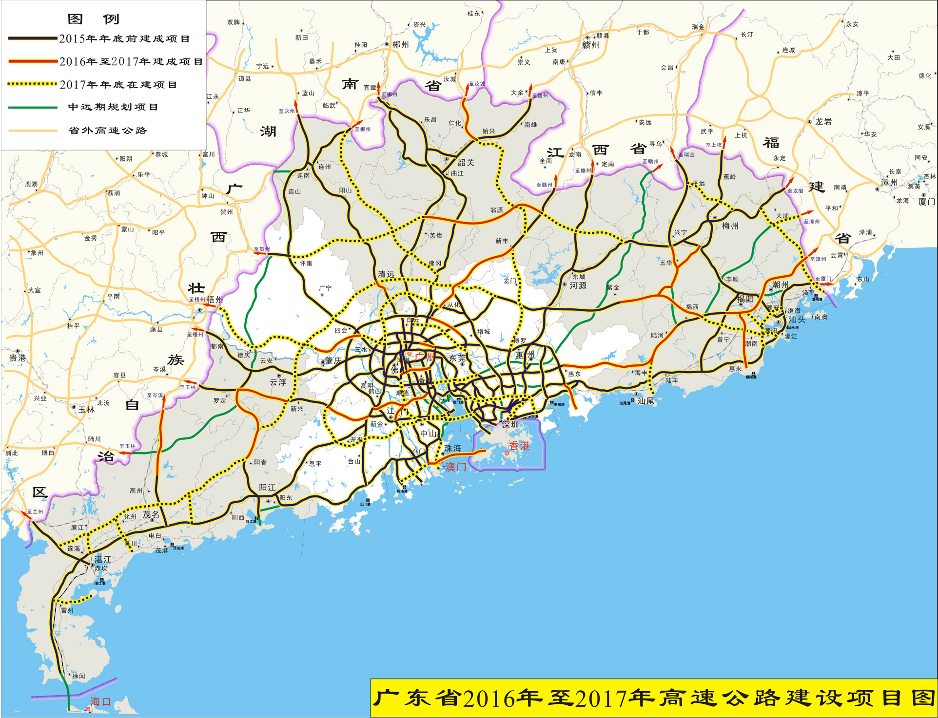 除2013年至2017年安排建設69個項目外,中遠期還將建設興寧至汕尾高速公路五華至陸河段、中山市東部外環(huán)高速公路、惠陽(沙田)至東莞(清溪)高速公路、懷集至陽江港高速公路懷集至郁南段、陽江海陵島大橋、河(源)惠(州)東(莞)高速公路、大(埔)豐(順)五(華)高速公路、羅定至信宜(粵桂界)高速公路等項目。上述項目建成后,我省將形成以珠江三角洲為核心,以沿海為扇面,以主要城市(港口)為龍頭向山區(qū)和內陸省區(qū)輻射的高速公路網(wǎng)布局,高速公路總里程將達到11570公里。