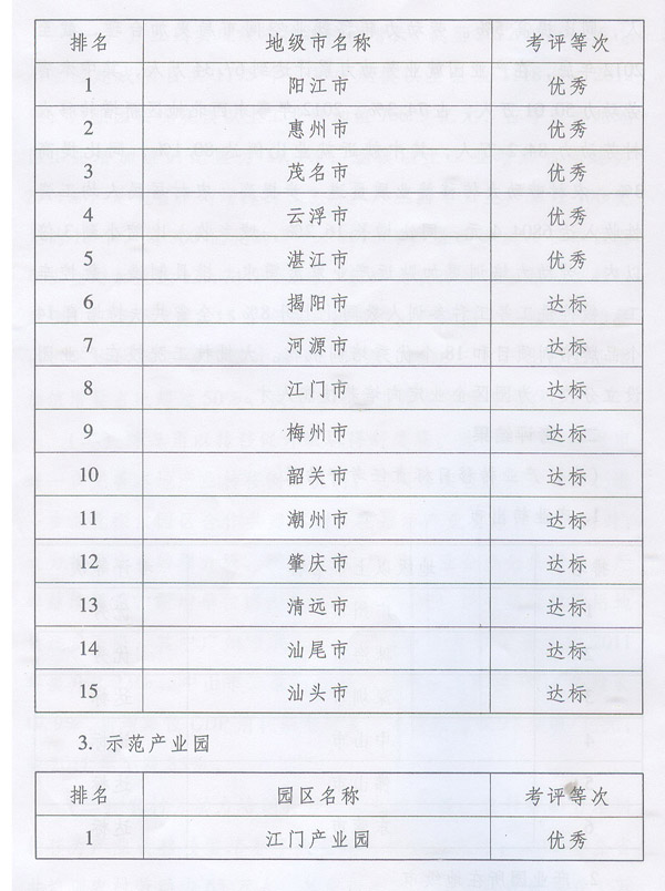 為貫徹落實《中共廣東省委廣東省人民政府關于進一步促進粵東西北地區(qū)振興發(fā)展的決定》(粵發(fā)〔2013〕9號),深入推進我省產業(yè)和勞動力雙轉移工作,推動省產業(yè)轉移工業(yè)園(以下簡稱產業(yè)園)提質增效,省經濟和信息化委、人力資源社會保障廳會同省雙轉移工作領導小組成員單位,按規(guī)定對2012年度雙轉移工作進行了考核評價?,F(xiàn)將考評情況通報如下: 一、2012年雙轉移工作基本實現(xiàn)預期目標 ?。ㄒ唬┊a業(yè)園實現(xiàn)經濟持續(xù)較快增長。截至2012年底,36個產業(yè)園建成項目共1795個,其中規(guī)模以上企業(yè)1118個。2012年,產業(yè)園實現(xiàn)規(guī)模以上工業(yè)增加值766.9億元,占粵東西北地區(qū)工業(yè)增加值的比重為19.7%;規(guī)模以上工業(yè)增加值增速為27.4%,是全省平均增速的3.3倍。產業(yè)園年工業(yè)產值超100億元的13個,超300億元的3個。2012年產業(yè)園建成項目單位面積工業(yè)增加值達129.74萬元/畝,新建成項目單位面積投資額達到381.69萬元/畝。15個產業(yè)承接市中,產業(yè)園工業(yè)增加值增量占比平均達到22%,其中韶關、河源、陽江三市產業(yè)園工業(yè)增加值增量占比超過50%,成為當?shù)毓I(yè)增長的重要載體。 (三)農村勞動力培訓轉移就業(yè)成效凸顯。農村勞動力培訓轉移為產業(yè)轉移轉型培養(yǎng)了大量適用性技能人才,2012年全省共培訓農村勞動力65萬人,其中獲中級工以上職業(yè)資格6.1萬人,同比提高5%。勞動力轉移就業(yè)空間布局更加合理,截至2012年底,在產業(yè)園就業(yè)勞動力累計達到67.34萬人,其中本省勞動力50.01萬人,占74.3%.2012年粵東西北地區(qū)新增轉移農村勞動力84.2萬人,其中就近就業(yè)比例達80.1%,同比提高3%。農村勞動力轉移就業(yè)質量進一步提高,農村居民人均工資性收入達6804.4元,同比增長16.2%,城鄉(xiāng)收入比縮小到3倍以內。勞動力培訓更加貼近產業(yè)發(fā)展需求,模具制造、數(shù)控車工、數(shù)控銑工等工種參訓人數(shù)同比上升8%。全省共扶持培育14個品牌培訓項目和18個優(yōu)秀培訓機構。大批技工院校在產業(yè)園設立分校,為園區(qū)企業(yè)定向培養(yǎng)技能人才。 (一)產業(yè)轉移目標責任考評結果。? 根據(jù)《廣東省產業(yè)轉移目標責任考核評價辦法》有關規(guī)定,特對評定為優(yōu)秀等次的廣州、珠海、陽江、惠州、茂名、云浮、湛江等7個地級以上市政府和江門產業(yè)園、廣州(陽江)產業(yè)園、中山(河源)產業(yè)園、中山(肇慶大旺)產業(yè)園、佛山(云浮)產業(yè)園、佛山順德(廉江)產業(yè)園、東莞大嶺山(南雄)產業(yè)園、深圳鹽田(東源)產業(yè)園、東莞鳳崗(惠東)產業(yè)園、中山火炬(陽西)產業(yè)園、東莞石碣(興寧)產業(yè)園等11個園區(qū)予以全省通報表揚,并按照有關規(guī)定給予相應獎勵。根據(jù)《廣東省產業(yè)轉移工業(yè)園升降級暫行辦法》有關規(guī)定,對考評排名靠后的深圳(汕尾)產業(yè)園、中山大涌(懷集)產業(yè)園、佛山禪城(清新)產業(yè)園予以黃牌警告。