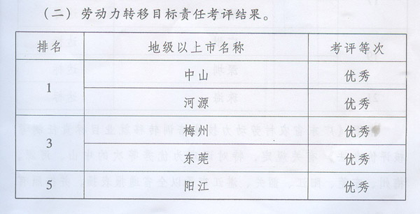 根據(jù)《廣東省農村勞動力技能培訓轉移就業(yè)目標責任制考核評價辦法》有關規(guī)定,特對評定為優(yōu)秀等次的中山、河源、梅州、東莞、陽江、韶關、湛江市予以全省通報表揚,并按照有關規(guī)定給予相應獎勵。 ? ? ? ? ? 廣東省人民政府 2013年8月26日 |