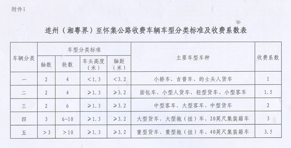 粵交費(fèi)〔2013〕1300號(hào)請(qǐng)示收悉。省人民政府同意連州(湘粵界)至懷集公路(即二廣高速公路懷集至連州段)交工驗(yàn)收通車和收費(fèi)站收費(fèi)設(shè)施經(jīng)驗(yàn)收符合省聯(lián)網(wǎng)收費(fèi)技術(shù)要求后開始收費(fèi),收費(fèi)車型按全省高速公路統(tǒng)一標(biāo)準(zhǔn),即按車輛軸(輪)數(shù)及車頭高度等物理參數(shù)進(jìn)行分類,一至五類車的收費(fèi)系數(shù)分別為1、1.5、2、3、3.5;粵湘省界至鶴塘段及連州連接線收費(fèi)標(biāo)準(zhǔn)為0.45元/標(biāo)準(zhǔn)車公里,鶴塘至懷集南段及懷集支線收費(fèi)標(biāo)準(zhǔn)為0.6元/標(biāo)準(zhǔn)車公里。