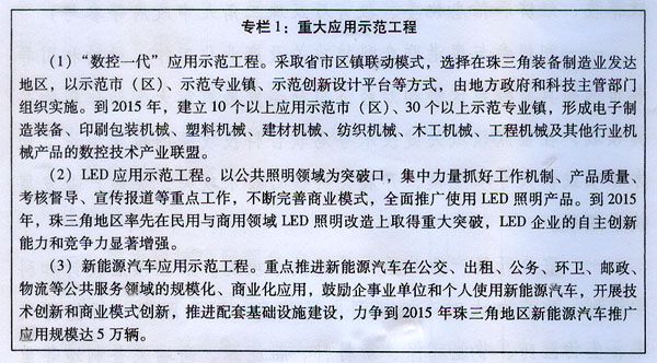 ?。ㄒ唬┩七M(jìn)重大科技成果推廣應(yīng)用。(省科技廳牽頭,省發(fā)展改革委、經(jīng)濟(jì)和信息化委、住房城鄉(xiāng)建設(shè)廳及珠三角九市政府等參與) ——深入開展商業(yè)模式創(chuàng)新,省市聯(lián)動(dòng)組織實(shí)施一批重大項(xiàng)目和新產(chǎn)品示范應(yīng)用工程,引導(dǎo)各市積極開展重大科技成果推廣應(yīng)用示范試點(diǎn),重點(diǎn)在高端新型電子信息、半導(dǎo)體照明(LED)產(chǎn)品、建筑節(jié)能與綠色建筑技術(shù)和產(chǎn)品、“數(shù)控一代”機(jī)械產(chǎn)品、新能源汽車等領(lǐng)域?qū)嵤┦痉锻茝V工程(專欄1);舉辦科技成果與產(chǎn)業(yè)對(duì)接活動(dòng),推動(dòng)創(chuàng)新成果加速產(chǎn)業(yè)化,加快重大科技成果產(chǎn)業(yè)化進(jìn)程。