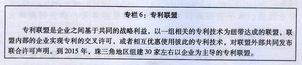 ?。ㄒ唬┥钊雽?shí)施知識(shí)產(chǎn)權(quán)戰(zhàn)略。(省知識(shí)產(chǎn)權(quán)局牽頭,省科技廳、質(zhì)監(jiān)局及珠三角九市政府等參與) ——推進(jìn)知識(shí)產(chǎn)權(quán)的創(chuàng)造與使用。加快實(shí)施戰(zhàn)略性新興產(chǎn)業(yè)自主創(chuàng)新工程及重大專利技術(shù)與產(chǎn)業(yè)化計(jì)劃,推進(jìn)專業(yè)鎮(zhèn)知識(shí)產(chǎn)權(quán)專項(xiàng)行動(dòng),完善知識(shí)產(chǎn)權(quán)評(píng)估交易機(jī)制,探索實(shí)施重大項(xiàng)目的知識(shí)產(chǎn)權(quán)評(píng)議制度,加快形成一批具有自主知識(shí)產(chǎn)權(quán)的產(chǎn)業(yè)和產(chǎn)品。推動(dòng)珠三角各行業(yè)建立跨行政區(qū)域的知識(shí)產(chǎn)權(quán)保護(hù)聯(lián)盟,加快發(fā)展專利聯(lián)盟(專欄6),構(gòu)建重點(diǎn)產(chǎn)業(yè)專利池,貫徹企業(yè)知識(shí)產(chǎn)權(quán)管理規(guī)范,提升企業(yè)專利運(yùn)用和管理水平。