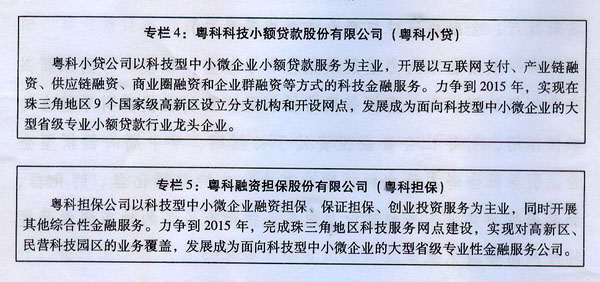 (二)引導(dǎo)發(fā)展科技信貸。(省科技廳牽頭,省財(cái)政廳、金融辦及珠三角九市政府等參與) ——強(qiáng)化廣州、深圳、東莞、佛山市科技和金融結(jié)合試點(diǎn)的輻射帶動(dòng)作用,促進(jìn)各市發(fā)展新型科技金融機(jī)構(gòu);鼓勵(lì)各市設(shè)立政府科技貸款風(fēng)險(xiǎn)補(bǔ)償金和科技貸款貼息資金,引導(dǎo)各類金融機(jī)構(gòu)創(chuàng)新科技型企業(yè)貸款模式、產(chǎn)品和服務(wù)。支持粵科科技小額貸款公司、粵科融資擔(dān)保公司(專欄4、5)在珠三角高新區(qū)、專業(yè)鎮(zhèn)與當(dāng)?shù)卣献髟O(shè)立子公司、分支機(jī)構(gòu),吸引社會(huì)資本,搭建覆蓋高新區(qū)和專業(yè)鎮(zhèn)的業(yè)務(wù)網(wǎng)絡(luò)平臺(tái)。積極開展知識(shí)產(chǎn)權(quán)投融資服務(wù),推動(dòng)科技保險(xiǎn)產(chǎn)品創(chuàng)新和科技擔(dān)保業(yè)務(wù)發(fā)展,提高科技信貸水平,形成科技金融產(chǎn)業(yè)發(fā)展新格局。