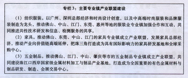?。ㄈ┩苿?dòng)專業(yè)鎮(zhèn)協(xié)同升級(jí)。(省科技廳牽頭,省經(jīng)濟(jì)和信息化委及珠三角九市政府等參與) ——發(fā)展專業(yè)鎮(zhèn)產(chǎn)業(yè)聯(lián)盟。支持各市專業(yè)鎮(zhèn)在家具、家電、紡織服裝等特色優(yōu)勢(shì)產(chǎn)業(yè)重要環(huán)節(jié)加強(qiáng)合作與交流,促進(jìn)專業(yè)分工和產(chǎn)業(yè)鏈延伸,形成專業(yè)鎮(zhèn)產(chǎn)業(yè)發(fā)展聯(lián)盟(專欄3)。