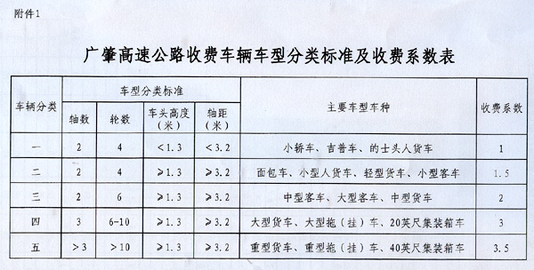 粵交費〔2014〕1802號請示收悉。同意廣肇高速公路蓮塘立交建成通車和收費站收費設(shè)施經(jīng)驗收符合省聯(lián)網(wǎng)收費技術(shù)要求后開始收費,收費車型按全省高速公路統(tǒng)一標準,即按車輛軸(輪)數(shù)及車頭高度等物理參數(shù)進行分類,一至五類車的收費系數(shù)分別為1、1.5、2、3、3.5,收費標準為0.45元/標準車公里。