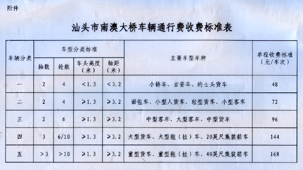粵交費〔2015〕197號請示收悉。同意汕頭市南澳大橋項目建成通車后在大橋接入南澳島處設(shè)置南澳大橋收費站,單向收取入島車輛雙程通行費。收費車型按車輛軸(輪)數(shù)及車頭高度等物理參數(shù)進行分類,一至五類車的收費系數(shù)分別為1、1.5、2、3、3.5;單程收費標(biāo)準(zhǔn)分別為48、72、96、144、168元/車次。
