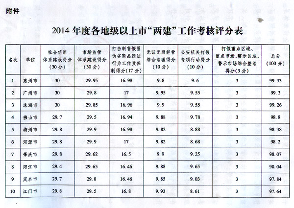 按照省委、省政府關(guān)于加強社會信用體系建設(shè)和市場監(jiān)管體系建設(shè)(以下簡稱“兩建”)工作部署和《2014年度廣東省社會信用體系建設(shè)和市場監(jiān)管體系建設(shè)工作考核方案》要求,省“兩建”工作領(lǐng)導小組辦公室牽頭組織省有關(guān)單位對各地級以上市政府“兩建”工作進行了考核。經(jīng)綜合評定,21個地級以上市考核全部合格,其中,惠州、廣州、珠海市成績顯著。經(jīng)省人民政府同意,現(xiàn)將全省“兩建”工作情況通報如下: