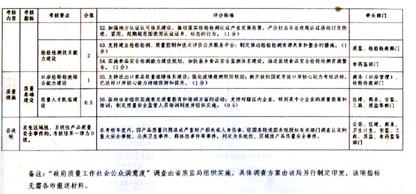 ?。ㄈ嵉睾瞬椤?0月底前,省質(zhì)量強省工作領(lǐng)導(dǎo)小組組織11個考核組開展實地核查??己私M每組4人,組長由省發(fā)展改革委、經(jīng)濟和信息化委、環(huán)境保護廳、住房城鄉(xiāng)建設(shè)廳、水利廳、農(nóng)業(yè)廳、商務(wù)廳、工商局、質(zhì)監(jiān)局、食品藥品監(jiān)管局等單位的廳級領(lǐng)導(dǎo)擔(dān)任;考核組成員由省質(zhì)量強省工作領(lǐng)導(dǎo)小組有關(guān)成員單位抽調(diào)熟悉相關(guān)工作的同志和專家組成。實地核查期間,省質(zhì)監(jiān)局組織有關(guān)單位同步開展政府質(zhì)量工作社會滿意度調(diào)查。實地核查工作要求見附件2.(四)綜合考核。11月15日前,省質(zhì)量強省辦根據(jù)各市自評情況、實地核查情況及相關(guān)數(shù)據(jù)對各市政府質(zhì)量工作進(jìn)行全面考核,評定考核等級,形成綜合考核評價報告。