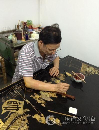 顧名思義,潮州推光金漆畫(huà)是在推光漆板上用金粉和金箔創(chuàng)作的畫(huà)。其創(chuàng)作要在光素的漆面上,用紅漆按需要繪好畫(huà)面,待紅漆將干而未全干略帶黏感時(shí)貼上金箔或涂抹金粉后,再用特制的鐵筆在畫(huà)面上刻劃出人物、山水、器物等的輪廓和細(xì)部,使畫(huà)面呈現(xiàn)金碧輝煌的藝術(shù)效果。潮州推光金漆畫(huà)制作過(guò)程分實(shí)木板制作、漆板制作、金漆畫(huà)繪制三大部分。首先,選用杉木作為制作實(shí)木板的木材,經(jīng)切割、粘合、拼接、打磨等工序制作出實(shí)木板。接著,在做好的實(shí)木板上,用木屑將木板上原有的裂縫和空洞填滿并磨平,再進(jìn)行三次的刮漆灰、蔭干、打磨,上漆、擦漆、推廣最后制成漆板。然后,在漆板上畫(huà)線稿、金地漆勾勒、貼金線。最后,按人物、建筑、植物、山石的順序繪制金漆畫(huà),繪制后運(yùn)用鐵筆對(duì)整個(gè)畫(huà)面進(jìn)行深入刻畫(huà)。
