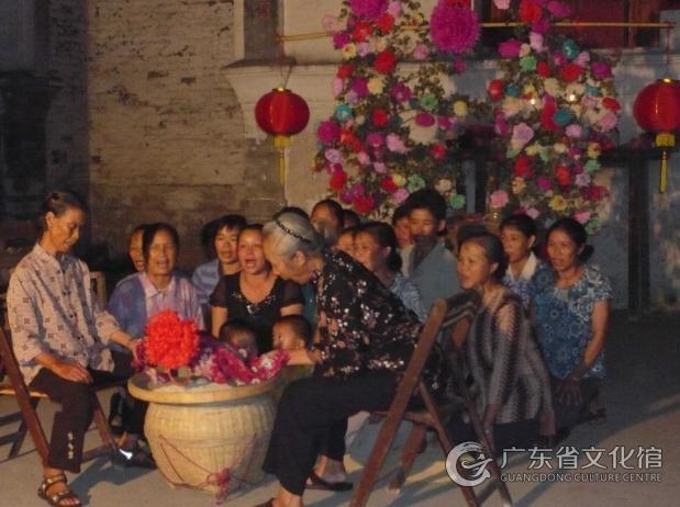“月姐歌”以當(dāng)?shù)鬲?dú)有的方言演唱,無伴奏清唱,有獨(dú)唱、合唱、對(duì)唱、表演唱等形式。歌詞涉及大量的農(nóng)業(yè)生產(chǎn)、生活、氣節(jié)的內(nèi)容,或敘事抒情,或敘述時(shí)令節(jié)氣,或描寫人間的冷暖世態(tài),或歌唱愛情?!霸陆愀琛被顒?dòng)由準(zhǔn)備活動(dòng)、接月姐、迷月姐、送月姐四部分組成。其中迷月姐為活動(dòng)重要環(huán)節(jié),包括:“繡香包”調(diào)、“石榴打花”調(diào)、“睇龍船”調(diào)三大部分?!袄C香包”調(diào)屬于宮調(diào)式,內(nèi)容主要表達(dá)男女之間的純真愛情;“石榴打花”調(diào)屬于徵調(diào)式,最具代表性,內(nèi)容多為表達(dá)人們對(duì)美好生活的向往;“睇龍船”調(diào)屬于羽調(diào)式,主要描寫人們賽龍舟時(shí)的熱鬧情景。
