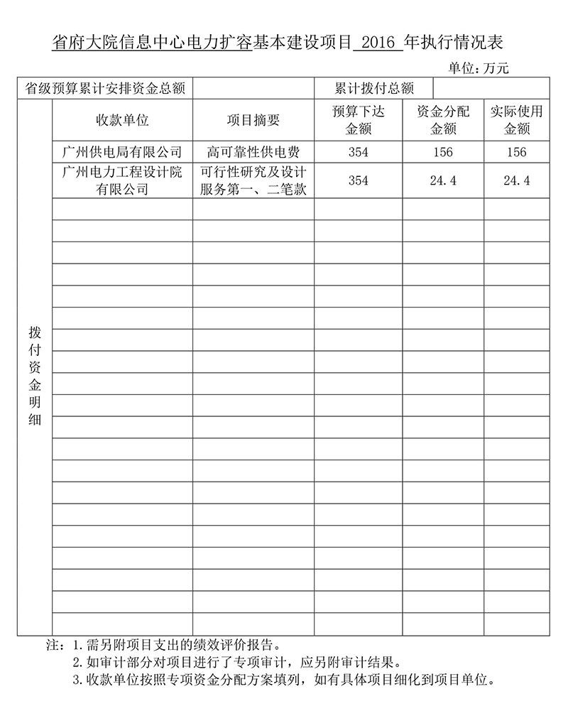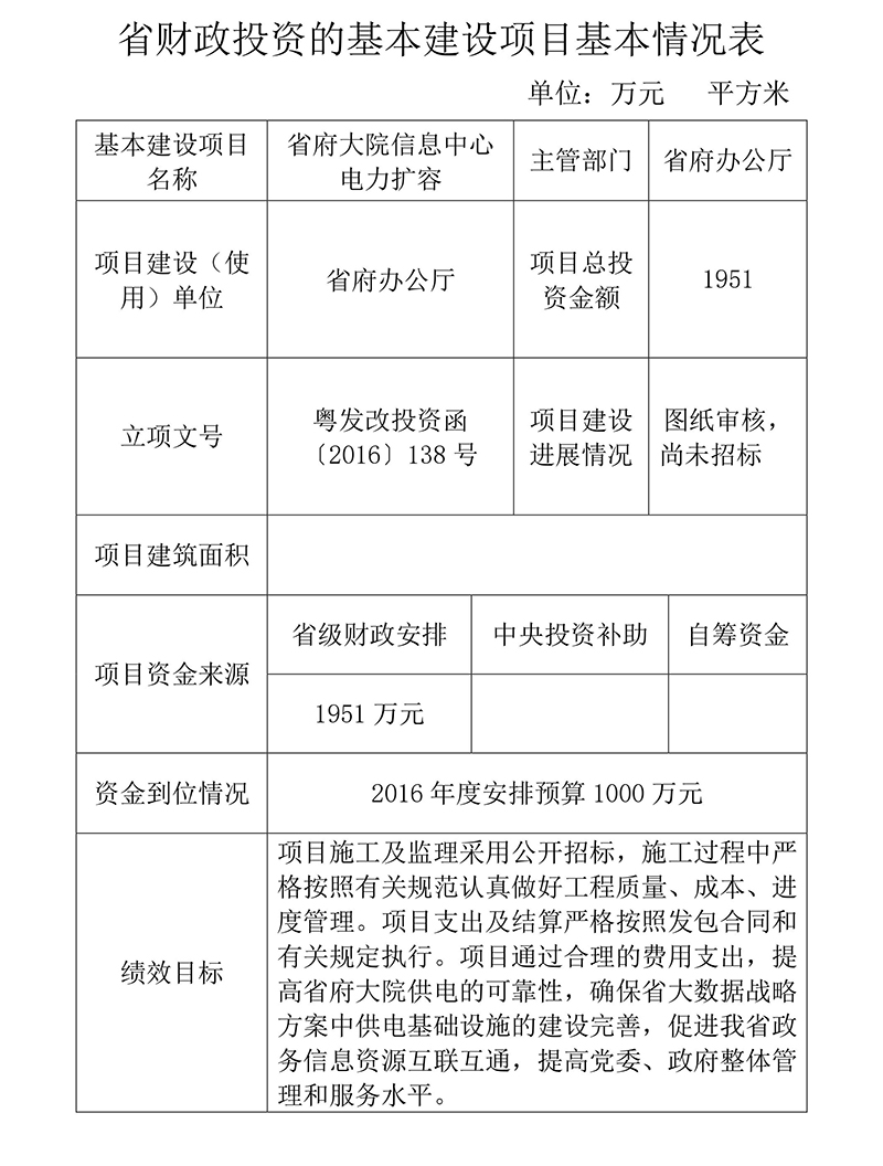 省府大院信息中心電力擴(kuò)容項目由我廳于2015年1月向省發(fā)展改革委申請立項(粵辦函〔2015〕1號),今年1月省發(fā)展改革委粵發(fā)改投資函〔2016〕138號文批復(fù)我廳同意項目立項,今年3月你廳粵財建〔2016〕27號文批復(fù)該項目2016年度預(yù)算資金1000萬元。