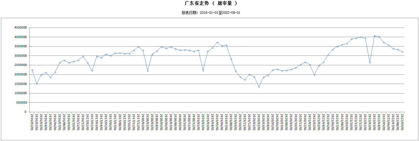 據(jù)對(duì)全省319家生豬定點(diǎn)屠宰企業(yè)跟蹤監(jiān)測(cè),9月份共屠宰生豬3226459頭,比8月份下降3.03%。