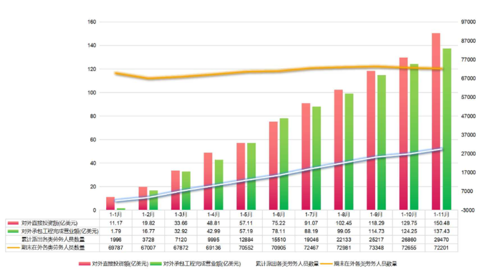 2021年1-11月,我省對(duì)外非金融類(lèi)直接投資額150.48億美元,同比增長(zhǎng)4.37%。對(duì)外承包工程完成營(yíng)業(yè)額137.43億美元,勞務(wù)項(xiàng)下和工程項(xiàng)下累計(jì)派出各類(lèi)勞務(wù)人員29470人,期末在外各類(lèi)勞務(wù)人員72201人。