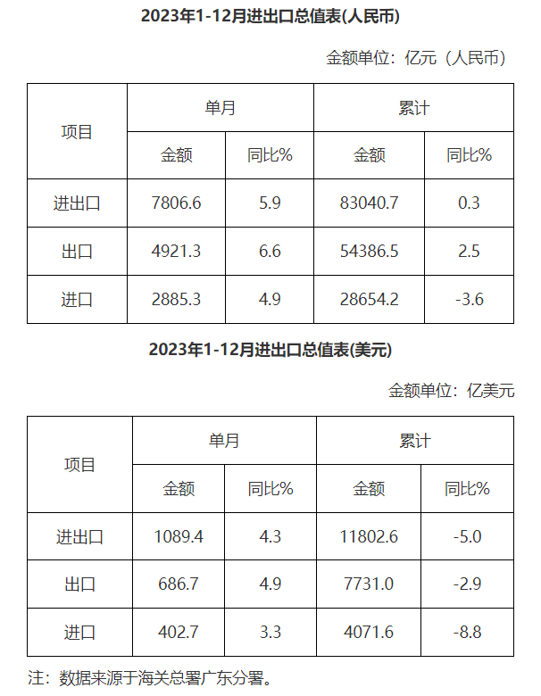 廣東省外貿(mào)進出口總值表(2023年1-12月)