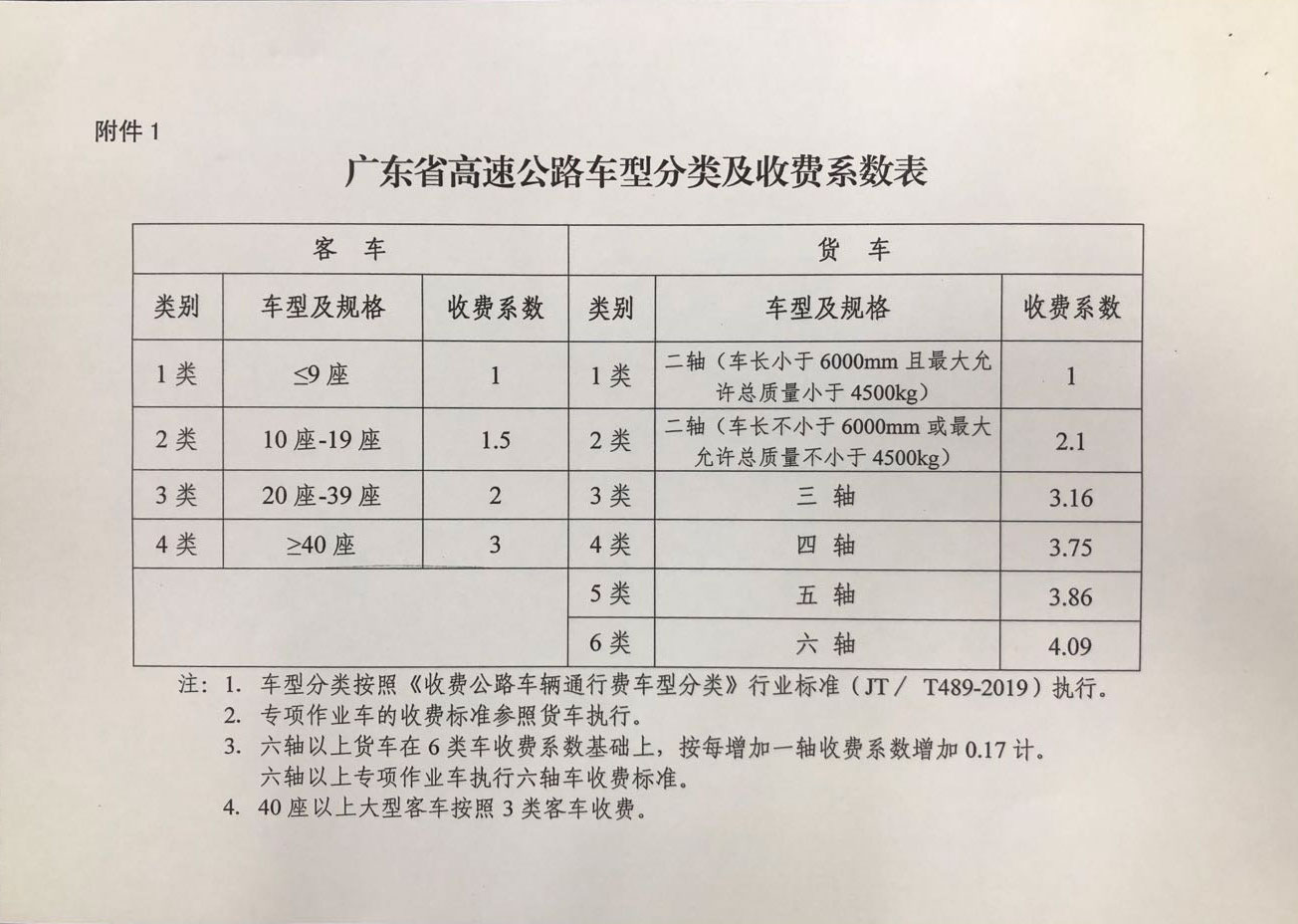 《關于廣東省龍川至懷集公路桃源北匝道收費站車輛通行費收費標準的請示》(粵交營〔2020〕483號)收悉。同意廣東省龍川至懷集公路桃源互通立交交工驗收通車和收費設施經(jīng)驗收符合聯(lián)網(wǎng)收費技術要求后開始收費,收費車型執(zhí)行《收費公路車輛通行費車型分類》(JT/T489-2019),收費費率為0.45元/標準車公里,1至4類客車的收費系數(shù)分別為1、1.5、2、3,1至6類貨車的收費系數(shù)分別為1、2.1、3.16、3.75、3.86、4.09,專項作業(yè)車的收費標準參照貨車執(zhí)行。