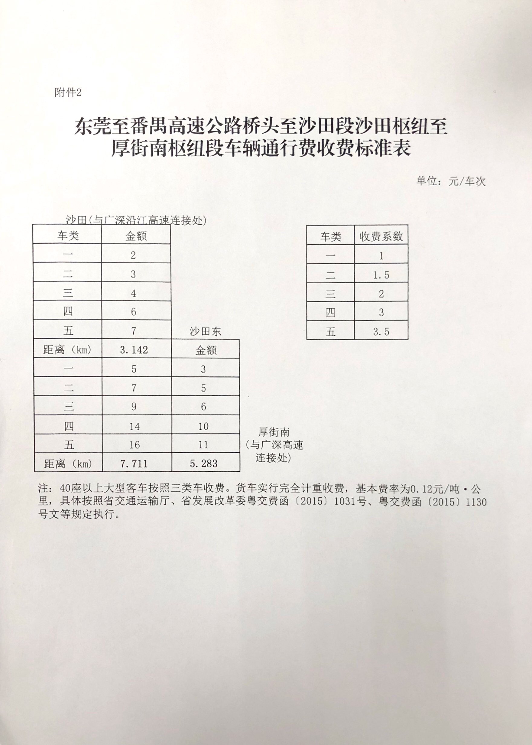 粵交費(fèi)〔2019〕333號(hào)請(qǐng)示收悉。同意東莞至番禺高速公路橋頭至沙田段沙田樞紐至厚街南樞紐段交工驗(yàn)收通車(chē)和收費(fèi)站收費(fèi)設(shè)施經(jīng)驗(yàn)收符合省聯(lián)網(wǎng)收費(fèi)技術(shù)要求后開(kāi)始收費(fèi),收費(fèi)車(chē)型按國(guó)家統(tǒng)一標(biāo)準(zhǔn)進(jìn)行分類(lèi),1至5類(lèi)車(chē)的收費(fèi)系數(shù)分別為1、1.5、2、3、3.5;貨車(chē)實(shí)行完全計(jì)重收費(fèi),基本費(fèi)率為0.12元/噸·公里。